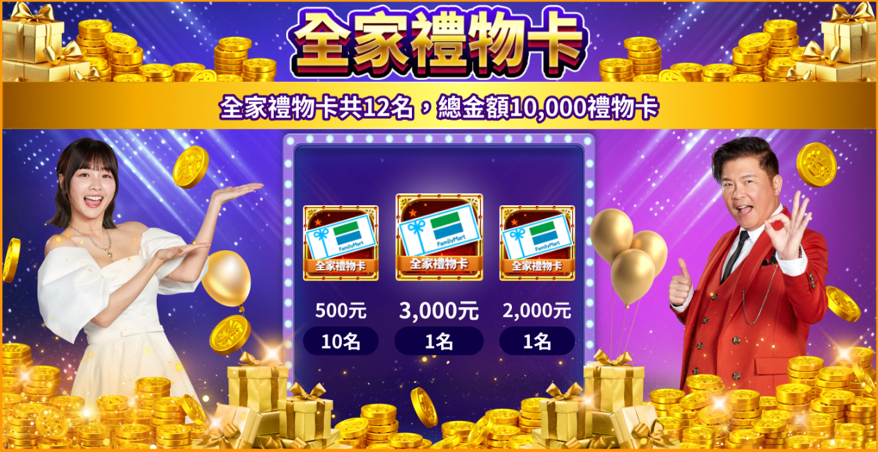 單筆儲值5,000點以上,加碼再送500元全家禮物卡,數量有限送完為止!