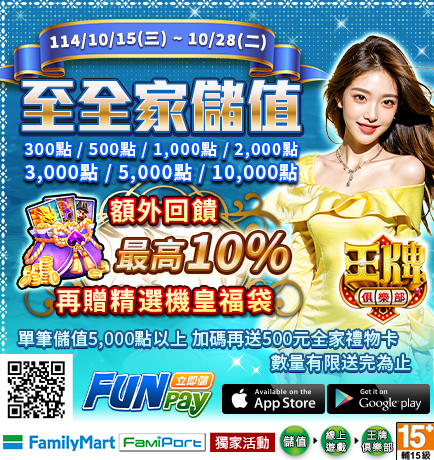 活動期間內,使用【FunPay全家立即儲】儲值指定面額,享額外回饋最高10%,再加贈【精選機皇福袋】,讓您機皇一把抓,大獎帶回家!