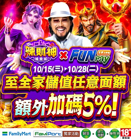 活動期間,玩家至全台「全家FUNPAY」單筆儲值「所有辣幣品項」,除了原有回饋,活動額外加碼「5%」,最高可獲得「119%」辣幣!
