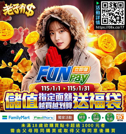 活動期間內,於全家FaMiPort機台購買《全家立即儲》指定面額,並儲值老子有錢加碼送福袋!越買越划算!........more